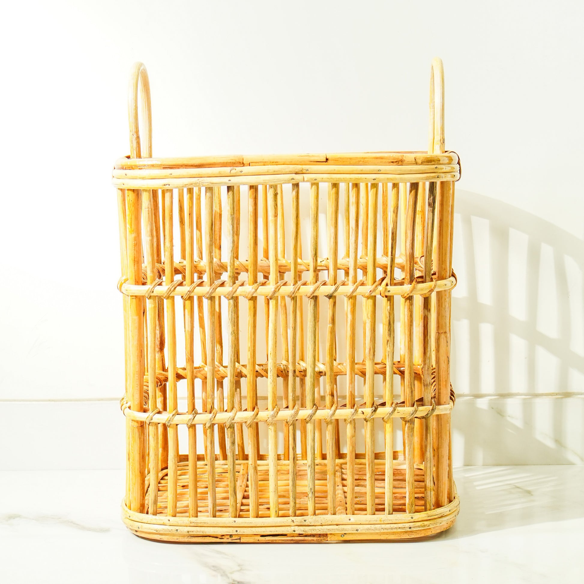 This handmade rattan rectangular laundry basket combines functional design with contemporary style. Its open structure with horizontal lines ensures good ventilation, preventing odors and keeping your laundry fresh. Spacious enough to hold a generous load, it features sturdy top handles for easy transport. Perfect for any modern home, this basket offers a practical and elegant solution for organizing laundry.